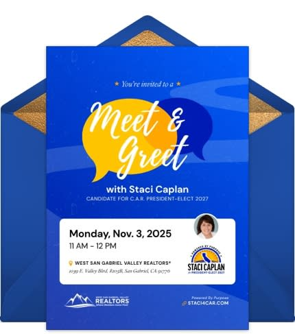On behalf of Staci Caplan, candidate for C.A.R. President-Elect 2027, we are pleased to invite you to a Meet & Greet on Monday, November 3, 2025, from 11:00 a.m. to 12:00 p.m. at the West San Gabriel Valley REALTORS® Headquarters, 1039 E. Valley Blvd., #205B, San Gabriel, CA 91776.